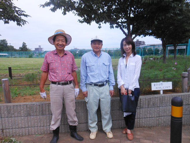 令和3年6月20日(日)、日野市と日野市観光協会の共催で行われているコスモスアベニューの種まきに参加しました。浅川のふれあい橋の北岸に位置する、浅川スポーツグラウンドの一画で行われました。前夜まで降り続いた雨のため開催があやぶまれましたが、当日はすばらしい好天に恵まれ、多くの団体の方々が参加して種まきがおこなわれました。